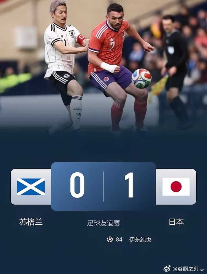 日本1-0绝杀苏格兰,伊东纯也替补制胜 发布时间:29/03/2026, 13:43:26 #苏格兰vs日本# 绝杀!技术压制力量! 日本1-0客胜苏格兰,下场将战英格兰! 此役,伊东纯也替补制胜,田中碧射门中框! 亚洲一哥,压的苏格兰喘不过气来!这就是日本足球的实力! 标签: 雨燕直播