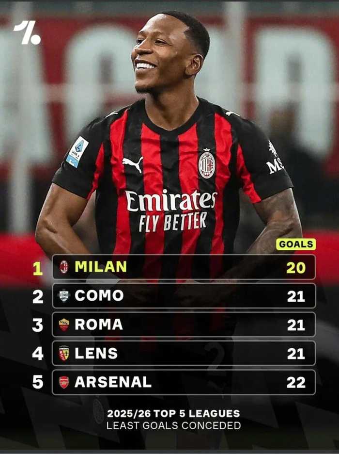 AC米兰本赛季五大联赛失球最少仅20球 发布时间:13/03/2026, 13:49:27 根据One Football的统计 ,AC米兰是本赛季欧洲五大联赛中失球最少的球队: - AC米兰,20球 - 科莫,21球 - 罗马,21球 - 朗斯,21球 - 阿森纳,22球 标签: 雨燕直播