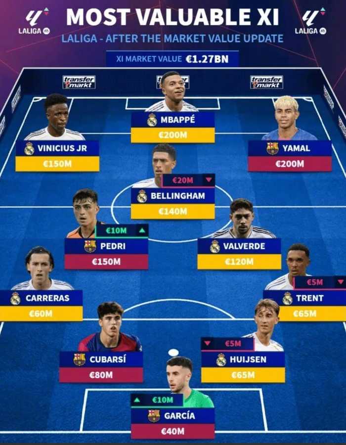 德转公布西甲身价最高11人阵容,姆巴佩亚马尔2亿欧领衔 发布时间:17/03/2026, 13:54:18 德转今日更新了西甲球员身价,并盘点了身价最高11人阵容,具体如下: 门将:乔安-加西亚(巴萨,4000万欧) 后卫:卡雷拉斯(皇马,6000万欧)、库巴西(巴萨,8000万欧)、赫伊森(皇马,6500万欧)、阿诺德(皇马,6500万欧) 中场:佩德里(巴萨,1.5亿欧)、贝林厄姆(皇马,1.4亿欧)、巴尔韦德(皇马,1.2亿欧) 前锋:维尼修斯(皇马,1.5亿欧)、姆巴佩(皇马,2亿欧)、亚马尔(巴萨,2亿欧 ) 标签: 雨燕直播